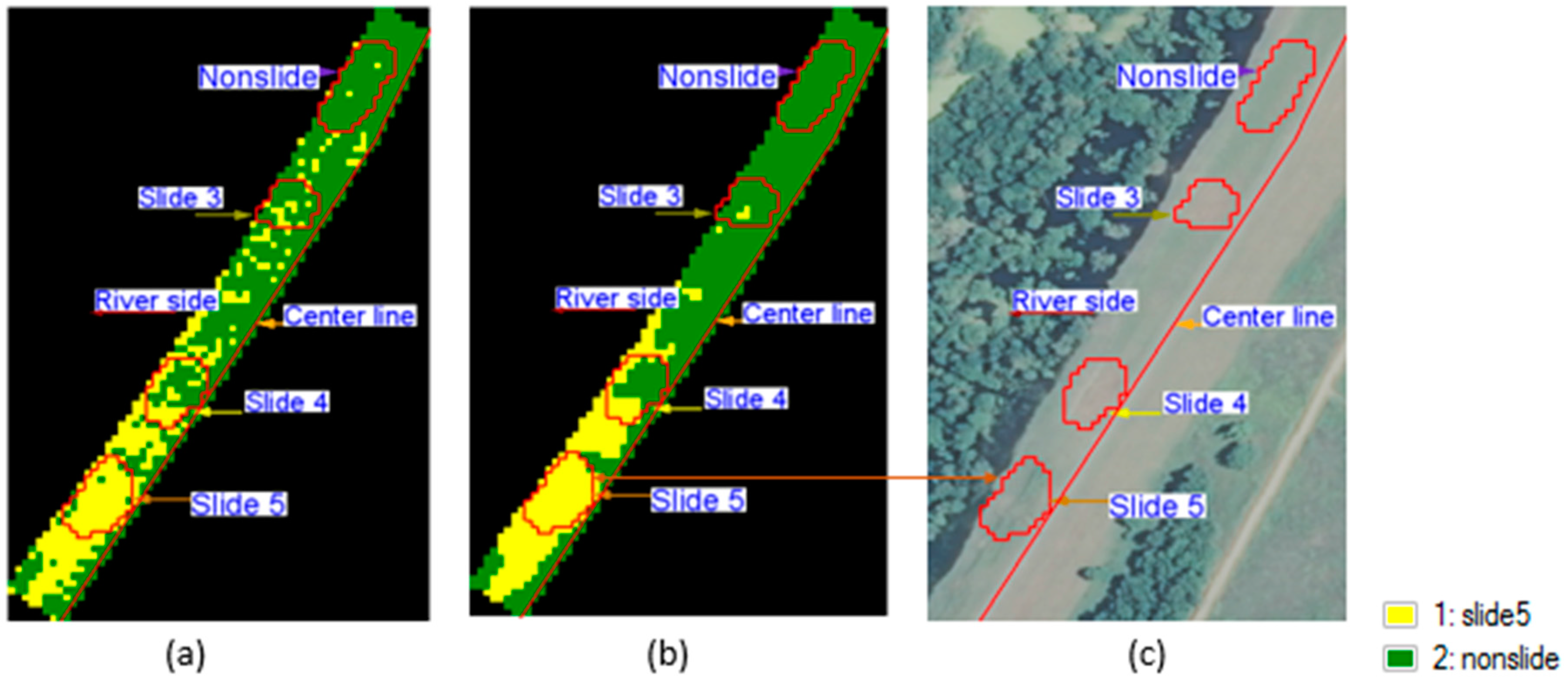 Magnitude data classification for the segment Sample 2: (a) without majority filter; (b) with majority filter; (c) optical image overlaid with slide and nonslide class shapes.
