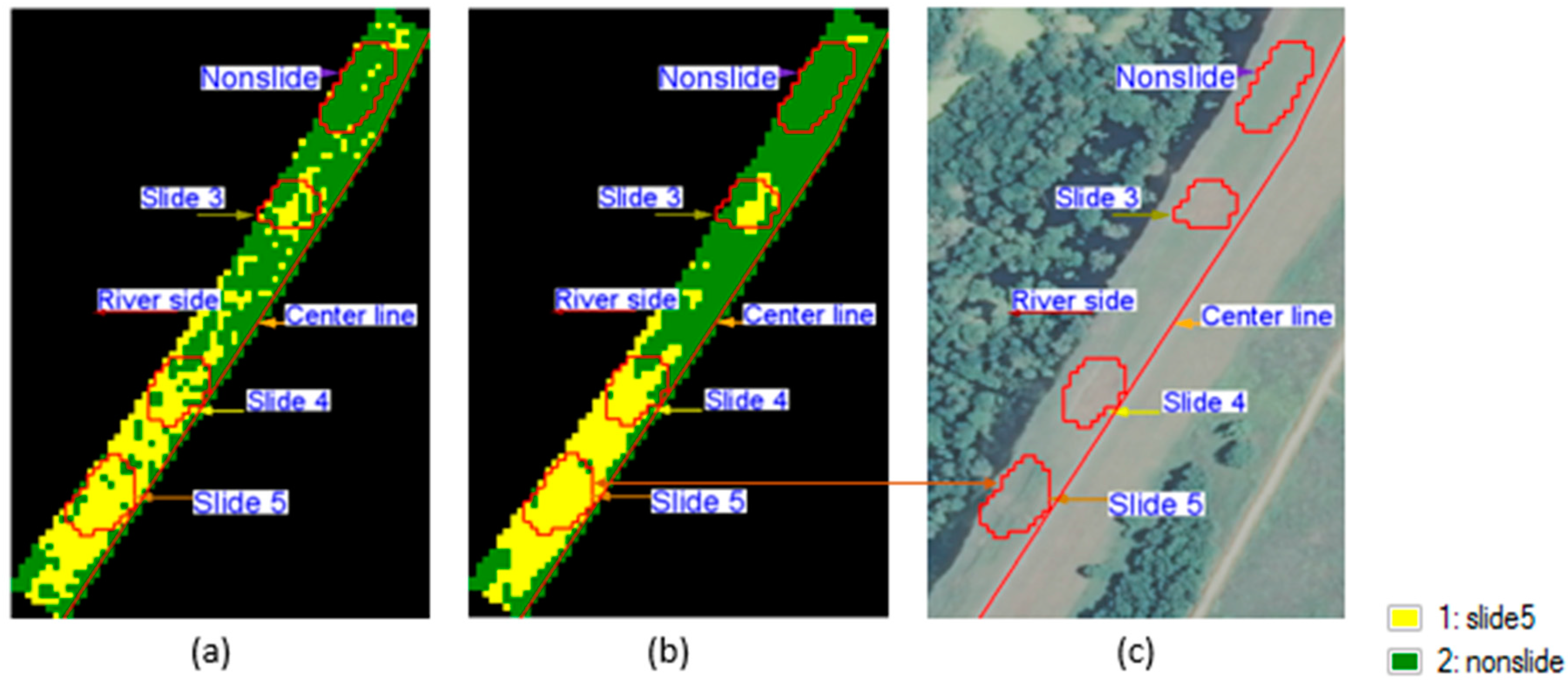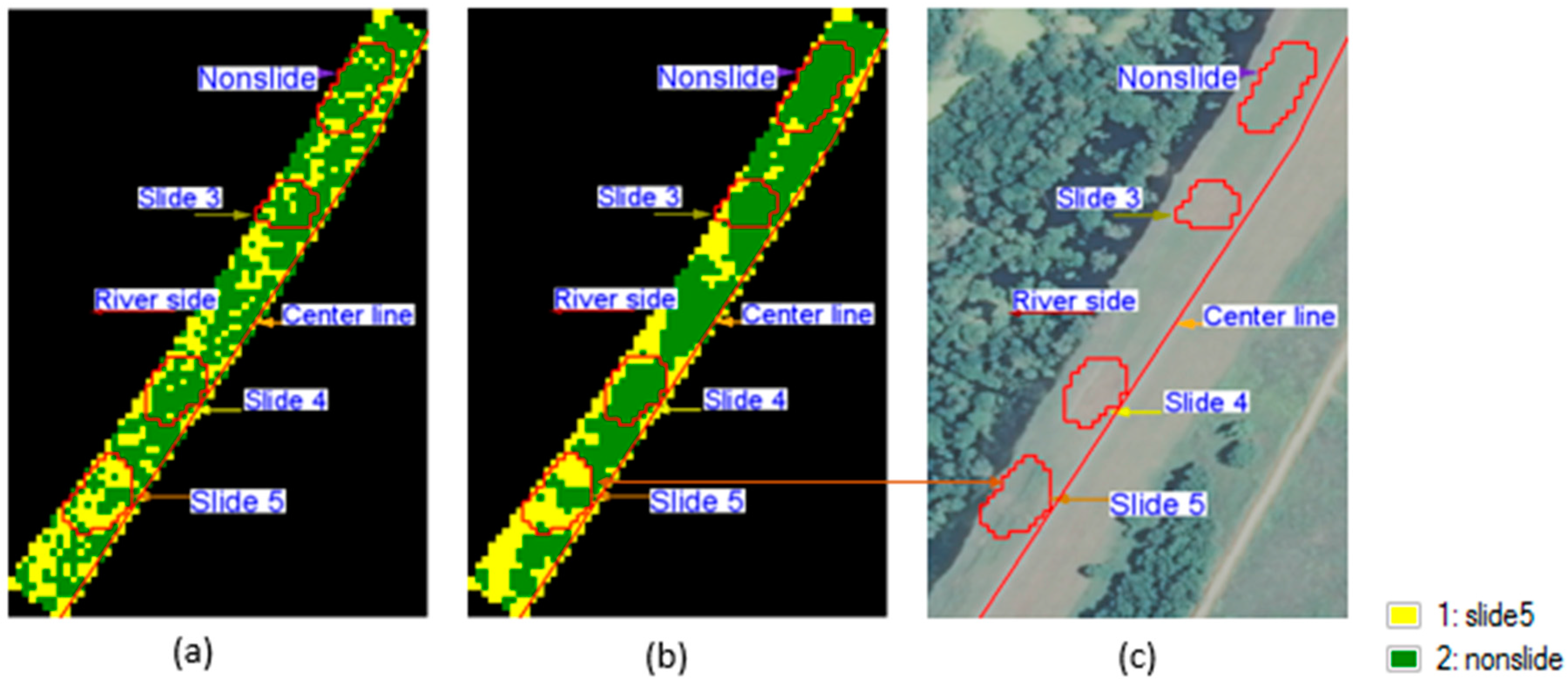 The availability of ground truth data for training the supervised classification processes is a challenge since the targets of interest are portions of the levee that show signs of impending failure. Once these are detected, they are quickly repaired depending on their severity [14]. The study area is one in which the levees are managed by the US Army Corps of Engineers (USACE) and are well-monitored. The Corps, in association with the local levee boards, maintains a good cumulative history of past problems and has identified particularly problematic sections of levees in the study area as shown in Table 1. These are used as training samples [13]. In addition to the ground truth data provided by the Corps, we have conducted field trips at the time of image acquisition to visually inspect the slides area and levee condition. The active slides (slides 1, 2, and 5) were present and unrepaired during the radar image acquisition time on 25 January 2010. Though the date of slide appearance was not identified by the Corps for slide 5, it is visible in the NAIP (National Agriculture Imagery Program) imagery collected in 2009 and 2010, and was not repaired until after the image acquisition as shown in Table 2. Hence, it was an active slide during the time of the image. Training masks were created for the slide events and labeled as either repaired or unrepaired at the time of acquisition. The training sample data from slide and nonslide (healthy) parts of the levees were obtained from the radar data using the training masks for analysis. The samples from the healthy parts of the levee near the slide events were used for training of the nonslide (healthy levee) class.