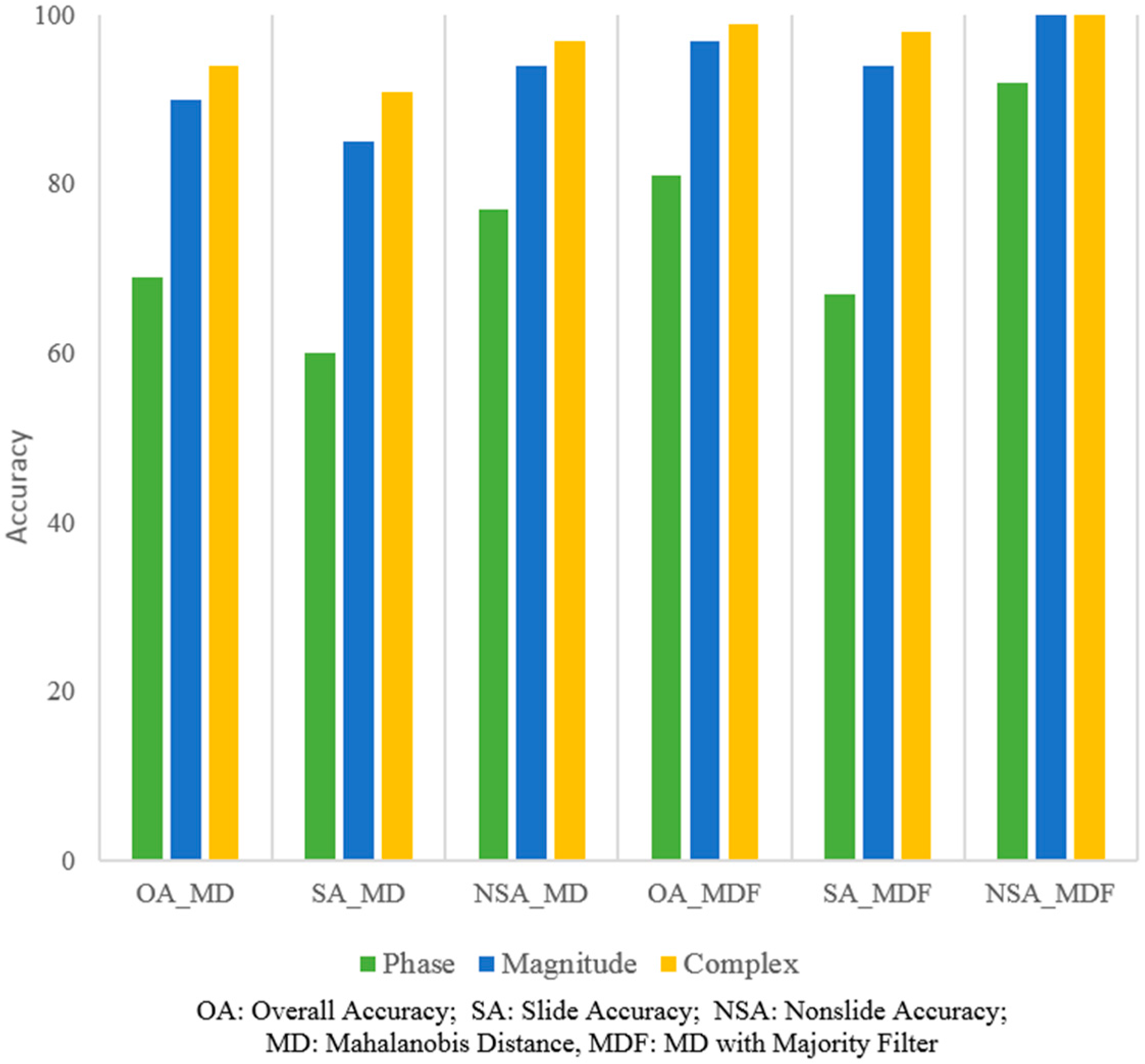 Accuracy analysis of the Mahalanobis distance (MD) classification and with majority filter (MDF) for slide and nonslide areas, of the segment Sample 3, using magnitude, phase, and complex data.