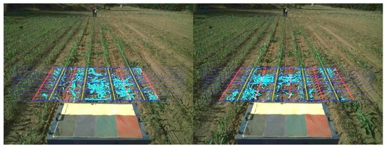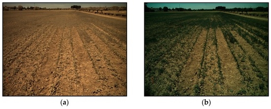 In agricultural outdoor environments the machine vision system works in adverse conditions where the natural illumination contains high NIR and UV spectral components (radiation). Generally, imaging sensors are highly sensitive to NIR radiation starting at 760 nm and to a lesser extent to UV, below 400 nm. Indeed, based on the spectral responses displayed in Figure 1b, the NIR heavily contaminates the three spectral channels (R, G and B), mainly the red channel in the range 760–800 nm, producing images with hot colors. This makes identification of green vegetation unfeasible. To avoid this undesired effect, cut-off filters are required, such as a Schneider UV/IR 486 [32]. Its operating curve specifies that wavelengths below 370 nm and above 760 nm are blocked, i.e., both UV and NIR radiations. Figure 2a displays just a corrupted image acquired without the UV/IR 486 cutting filter and Figure 2b equipped with such filter. As mentioned above, without such a filter the contamination is obvious and the undesired effect is clearly minimized with the filter. These images were acquired with a CCD-based sensor with the corresponding optical system onboard the tractor dedicated to maize crops belonging to the fleet of robots in the RHEA project [28]. Details about this system are provided in section five.
