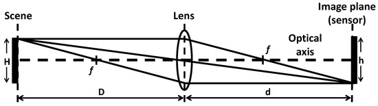 An important subject concerning the optical system is the selection of the focal length [53]. Depending on the field of view, the working distance where objects of interest are placed and the sensor sizes, the focal length requires a convenient selection. As mentioned before, it is well-known that the main element in the optical systems is the lens with its corresponding focal length, f, where in a converging lens all incoming rays parallel to the optical axis intersect. Figure 8 displays the basic elements of a generic converging optical system. H represents the field of view in the scene, h is the sensor size, D is the working distance and d is the distance from the lens to the image plane, i.e., the focus distance where the object appears focused on the image plane.