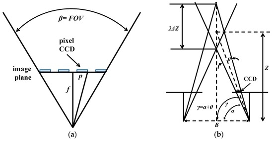 An important step during the machine-vision selection process is to consider the imaging sensors and the optical system together. As mentioned before, CCD or CMOS devices consist of pixels conveniently arranged in matrices with specified horizontal (H) and vertical (V) sizes or linearly as an array of pixels. The variety of sensors with different H × V sizes or linear sizes is certainly high, commercially there is a high variety of ranges, from 160 × 120 to 6576 × 4384 or above, UV and NIR-based systems contain the lower resolutions. The product H × V determines what is called MegaPixel (MP) in terms of millions of pixels, for example, a device with resolutions of 3376 × 2704 is measured as 9.1 MP. Physically each pixel has its own horizontal (h) and vertical (v) sizes, typical values range from 3.45 to 7.50 µm. The nominal sensor sizes, horizontal (Sh) and vertical (Sv), can be computed as Sh = h × H and Sh = v × V; nevertheless, real dimensions are a bit larger in size because the required alignments and arrangements. In summary, CCD and CMOS chip sizes vary considerably [46]. Historically, these dimensions come from Vidicon TV cameras with their imaging tubes projecting the image in a circle with a given diameter. CCD/CMOS chips are designed with rectangular dimensions with their corresponding diagonal lengths. The following association (type, diagonal) is established between the type of sensor and its diagonal in length units expressed in mm: (1/8″, 2.0), (1/6″, 3.0), (1/4″, 4.0), (1/3.6″, 5.0), (1/3.2″, 5.68), (1/3″, 6.0), (1/2.7″, 6.72), (1/2.5″, 7.18), (1/2.3″, 7.7), (1/2", 8.0), (1/1.8″, 8.93), (1/1.7″, 9.50), (1/1.6″, 10.07), (2/3″, 11.0), (1/1.2″, 13.3), (Super 16 mm, 14.54), (1″, 16.0), (4/3″, 21.6), (Canon APS-C, 26.7), (Pentax Sony Nikon DX, 28.4), (Canon APS-H, 34.5), (35 mm, 43.3), (Leica S2, 54.0), (Kodak KAF 3900, 61.3), (Leaf AFi 10, 66.57) or (Phase One P 65+, 67.4). A specific sensor is assigned to the type whose diagonal is at least as large as the one of the sensor. For example, assume a chip with sizes 11.6 × 9.5 mm2, with diagonal of 14.99 mm, it will be assigned to the type 1″. This will lead to some geometric constraints of particular interest in machine vision systems in agriculture and particularly for stereovision systems and also when choosing the optical lenses, as we will see later.