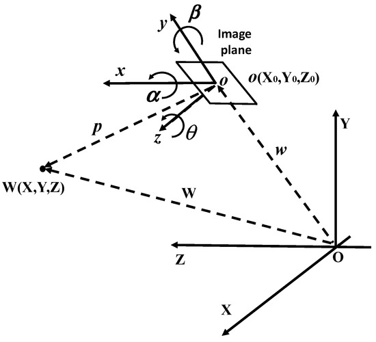 The point W(X,Y,Z) is expressed in the 3D space with respect to the OXYZ world reference system. The origin o of the image plane is displaced with respect O according to the vector w with coordinates (X0,Y0,Z0). The elementary translations and rotations as described in Section 4 are expressed as follows, including the focal length (f),