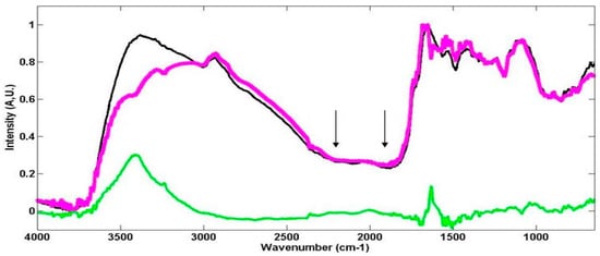Example of control (black), exposed (purple), and difference (green) FTIR spectra of Vicia faba samples treated with 30 g L−1 As. The negative values observed for the difference spectrum in the range between 3100 and 1400 cm−1 show a reduction of the molecular absorptions in the exposed samples with respect to the control sample. The two black arrows show the range where a flat water band could be observed in the case of a non-efficient lyophilisation.