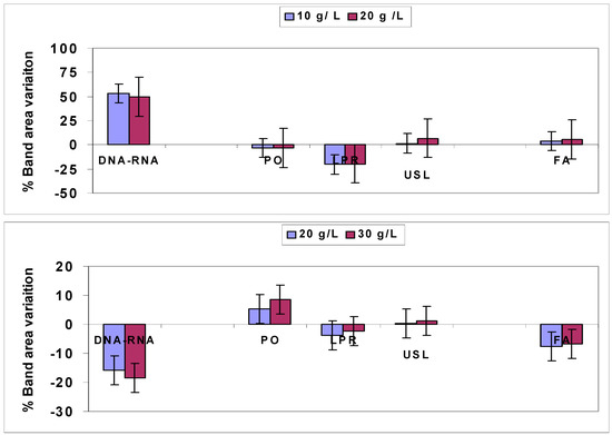 Bar charts of the band area variation with respect to the control sample observed in the FTNIR spectra for the As exposure of the June (upper) and July (bottom) plots. Here, the results are the average of the three replicated spectra for each As exposure.