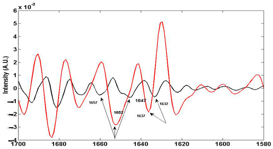 Second derivative FTIR spectra of Amide I bands in Vicia faba roots for the As exposure in June for the same sample of Figure 6. For the July exposure, the FTIR spectra are highly comparable. The black spectrum is the control samples, and the red spectrum is the exposed sample. The arrows show the transitions between the beta sheet (1632 cm−1) with the appearance of random coil (1637 cm−1) and molecular rearrangements within the alpha helix structures in the 1645 to 1660 cm−1 range.