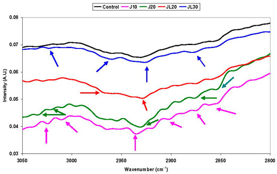 FTIR spectra in second derivative mode showing the increased lipid disorder by the band shifts of the lipid acyl –CH2 bands in samples exposed to As in June and July. This FTIR plot includes all the samples considered in the study. As a qualitative case, the average and standardized spectrum of each sample was considered. “J10” and “J20” are June samples treated with As 10 and 20 g·L−1, respectively. “JL10” and “JL20” are July samples treated with As 10 and 30 g·L−1, respectively. The arrows (with the same colour of the sample) show the ranges where the band shape changes are more relevant with respect to the control samples.