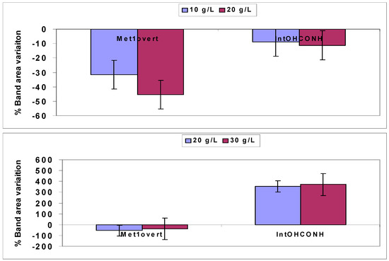 FTNIR bands are less numerous than those of FTIR spectra as shown by Figure 2 and Table 2. However, the structural changes evidenced by FTNIR spectroscopy gives us peculiar structural information. The MET1overt parameter measured by comparing the 6000 and 5600 cm−1 (first overtone of aliphatic chains) absorptions of the control and exposed sample, is linked to the re-orientation of lipids called lipid disorder [15], already described by means of FTIR spectra. Changes in hydrogen bond interactions (i.e., the IntHCONH parameter), measured as the ratio in the 5300 to 4900 cm−1 range between the control and exposed sample, describes the interaction among –C=O and -NH groups of proteins, linked to inter and intra hydrogen bond changes of proteins [8,9].