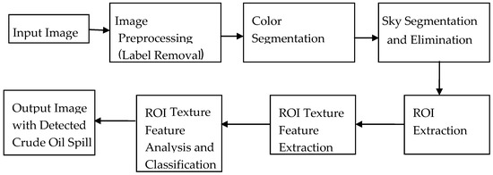 The crude oil spill detection algorithm developed using the sample images is depicted in Figure 2. It involves six major steps. These are image preprocessing, crude oil color segmentation, sky elimination segmentation, Region of Interest (ROI) extraction, ROI texture feature extraction, and ROI texture feature analysis and classification.