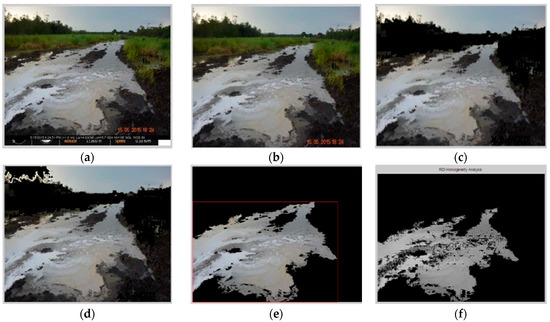 There is a possibility that the presence of water puddles may affect the efficiency of the algorithm to a certain extent. However, the authors anticipate that the color of the water puddles will mostly lie outside the identified RGB range for crude oil and will therefore be eliminated during the Color Segmentation stage as well as the ROI extraction stage. Reflections on the surface of the water may also affect the algorithm’s performance in the same way the algorithm was affected by reflections on the surface of crude oil spills. Further tests will be conducted on images containing water to investigate the algorithm’s performance in eliminating water puddles and validating its specificity for crude oil spills. The spill detection algorithm developed in this article is intended to be employed by robotic oil spill surveillance systems that employ other methods to detect crude oil spills [48,49]. These systems primarily detect crude oil spills by means of gas sensors. However, after successful detection, they obtain and transmit spill images to relevant authorities using an on-board camera. The algorithm developed in this article can be integrated into this system as an additional step in spill verification and quantification.