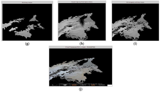 Oil Spill Detection Algorithm Implementation on Case Image OS69. (a) Case Image OS69; (b) Preprocessed image; (c) Color Segmentation Image; (d) Sky Segmentation Image; (e) Selected Primary ROI; (f) ROI homogeneity Image; (g) Entropy Image; (h) PSD image; (i) ROI homogeneity and entropy features; (j) Detected Crude Oil Spill from OS69.