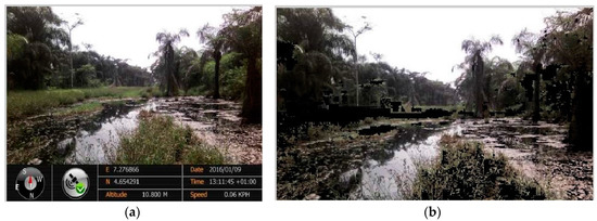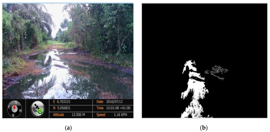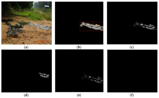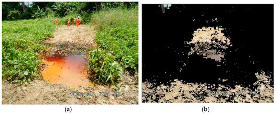 Another factor that affected the algorithm’s ability to detect crude oil spills in the images was the presence of reflections on the surface of the crude oil surface. When sunlight, vegetation and other objects cast their shadows on the surface of the spill, it alters the natural color of the spill, causing it to fall out of the defined RGB color range for crude oil spills and rendering the algorithm unable to identify such shadowed regions as crude oil spills. Figure 8a is the sample image OS8, which clearly shows a crude oil spill containing not only weeds, but also reflections of the surrounding vegetation, as well as reflections from the sunlight above. The detected crude oil spill from the OS8 is shown in Figure 9b. The algorithm was unable to detect the regions of the crude oil spill with vegetation reflections and weeds. This considerably reduced the area of the crude oil spill detected by the algorithm.