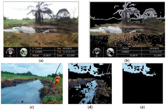 After the successful development of the spill detection algorithm, the algorithm was tested further on case images also drawn from the SPDC website. A total of 56 case images were utilized in testing the efficiency of the crude oil spill detection algorithm developed with the aid of the 25 sample images. The 56 case images contained crude oil spill with varying volumes, making it possible to test the ability of the algorithm to detect minute spills as well as large-volume spills. Figure 1a,b show sample images from the sample and case images respectively.