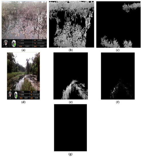 Effect of Weeds on Crude Oil Spill Detection. (a) Sample Image OS22; (b) primary ROI for OS22 after preprocessing, and sky and color segmentation removal; (c) Identified Crude Oil Spill from OS22; (d) Sample Image OS25; (e) Primary ROI for OS25 after preprocessing, and sky and color segmentation removal; (f) Homogeneity Analysis Result for OS25; (g) Identified Homogeneity ROI for OS25.