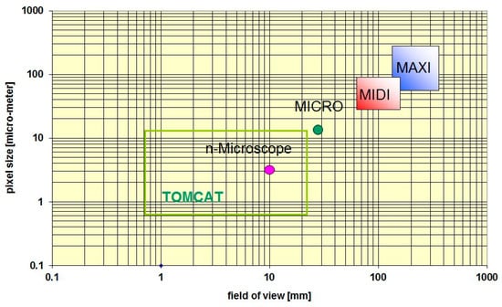 Working areas of camera based detection systems with respect to field-of-view (FOV) and pixel size (the logarithmic scale needs to be considered); corresponding conditions at the synchrotron beam line TOMCAT [10] are added for comparison; MAXI (up to 40 cm); MIDI (up to 15 cm); MICRO (fixed to 27 mm FOV); n-Microscope (5–10 mm FOV).