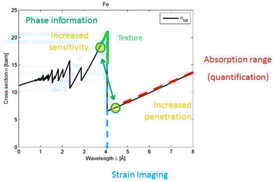 Options to use energy selective imaging near the Bragg edges of iron; there is mainly absorption above 4 Å while elastic scattering is not relevant for quantification anymore.