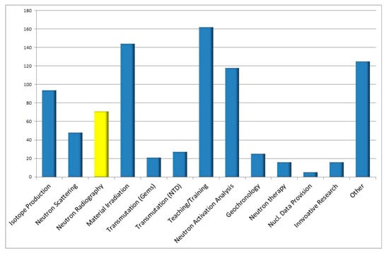A more complete picture about the situation with respect to their utilization can be derived by the declaration of the operators as given in Figure 5. In this framework, it is quite remarkable and also surprising that “neutron radiography” is declared to be applied in 71 cases, more than “neutron scattering” in only 41 cases. For comparison: as a scientific analytical tool, neutron activation analysis (NAA) is available at 118 facilities (see the data in Figure 6).