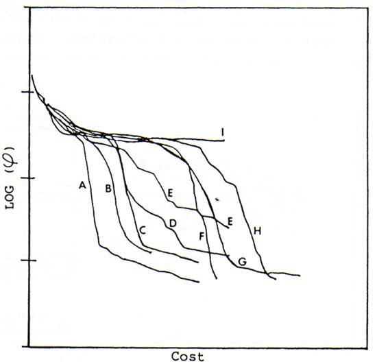 Figure 1 shows a comparison of the convergence rates of several optimization algorithms when designing a triplet lens. The PSD III method is in curve A, and curve I is DLS. (The other curves refer to other algorithms that have been tested [11]). The merit function is given by φ, and the cost is the elapsed time to get that value. Few technical fields experience an improvement of this magnitude at one stroke. I am still amazed by the results.