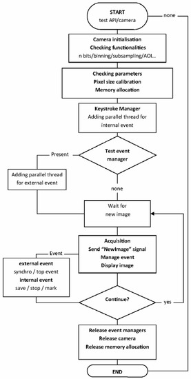 The plug-in for ImageJ was designed to use the drivers from IDS. The Software-Development-Kit (SDK) of the camera only supports C++. However, plug-ins for ImageJ must be developed in Java, so JNA-4.2.1 libraries were used for the communication between the plug-in and the SDK. With Java, code can be developed so that it is independent of the platform and directly compatible with 32 bit and 64 bit operating systems. The general workflow of the HF_IDS_Cam is presented in Figure 1.