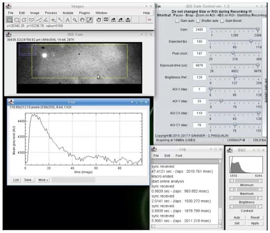 The video flow from the camera is directly displayed in ImageJ. As shown in Figure 1, the camera must be selected at program start. At the same time, a log window supplies pieces of information about the camera and its initialization. A dialog box opens, allowing the user to define pixel size and select pixel depth—up to 16 bit—to record fluorescence signals. The user can also use binning and subsampling modes if the camera is compatible. Binning modes allow the user to decrease spatial resolution to increase the maximum acquisition frame rate and the signal amplitude. The subsampling mode can be used to decrease the spatial resolution of the image to reduce its size. Through this dialog box, serial ports can be activated to capture synchronization, and analog signals can be input from other devices (see online information to capture trigger signal at http://pccv.univ-tours.fr/ImageJ/HF_IDS_Cam/). The video flow is then displayed in a traditional ImageJ window. The control panel allows for modification of several parameters of video capture, including signal gain, frame rate, pixel clock, exposure time, brightness, AOI size, and position. Selection of an AOI allows for the limitation of the video reading area so that the frame rate can be increased and the amount of data recorded can be decreased. Size and position adjustment of the AOI are possible during video capture. More detailed explanations of each control are provided in the user guide available online at http://pccv.univ-tours.fr/ImageJ/HF_IDS_Cam/.