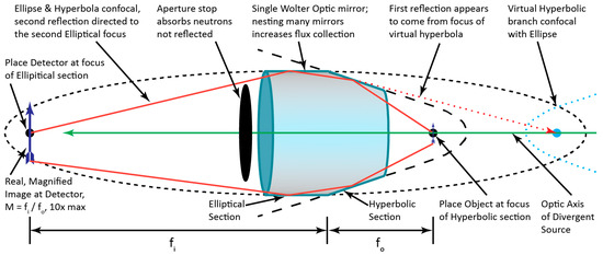 It was recently demonstrated that Wolter mirrors, which are widely used in X-ray telescopes, could be used as neutron-image forming optics [7,8]. Briefly, Wolter mirrors are axisymmetric mirrors composed of two conic sections, see Figure 1. With such optics, one could realize several improvements in neutron imaging over the pinhole optics geometry. First, there is a large distance, of order meters, between the sample and optics (and optics and detector) enabling the introduction of bulky sample environment or beam conditioning devices without the loss of spatial resolution. Second, the image resolution is determined by the optics and not the beam collimation (or L/D ratio). (This is generally true for any optical system which employs image-forming mirrors or lenses.) Therefore, the aperture size D could be increased so that the sample is illuminated by the full power of the divergent polychromatic neutron beam. Third, many mirrors can be nested to increase the solid angle portion of the beam collected by the optics, resulting in orders of magnitude increase in the neutron fluence rate for high spatial resolution imaging. Fourth, optical magnification can be achieved in order to improve the spatial resolution. As in geometrical optics, the magnification is given by the ratio of focal lengths (fi and fo in Figure 1).