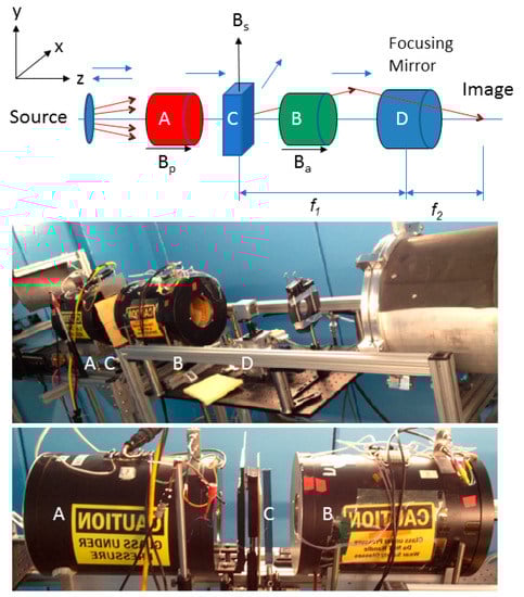 Layout sketch and two photographs of the WHIMS experiment. The beam travels left to right along the positive z-direction. Visible in the top photograph are the 3He polarizer (labeled with a white A), 3He analyzer (labeled with a white B), the Wolter optic inside the small aluminum box (labeled with a white D), beam-limiting aperture, and the evacuated beam tube. In the bottom photograph, the polarizer solenoid, the sample solenoid (labeled with a white C) placed in the focal plane of the Wolter optic, and the analyzer solenoid are shown. Due to the use of solenoidal holding fields, the neutron polarization axis, shown as blue arrows in the sketch, is along the z-direction. The longitudinal magnetic fields from the magnetically shielded polarizer and analyzer solenoids drop off rapidly but are sufficient to maintain the neutron’s spin direction. Since they are roughly an order of magnitude lower than that of the sample solenoid’s vertical field, they were not include in the analysis. The sample field, Bs, is along the y-axis, thus causing the neutron spin vector to rotate in the x-z plane. The detector is far beyond the left edge of the photograph.