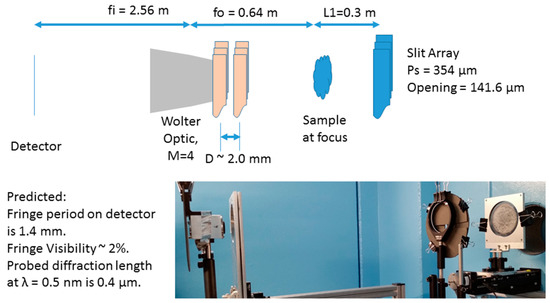 For this demonstration, we employed optical components that were readily available, namely the phase modulating gratings had a period of 2.4 µm, the source grating was composed of Gadox powder deposited onto silicon combs with a period of 354 µm and duty cycle of 40%, and the Wolter optic previously described. This led to the configuration, which is shown in Figure 3, and which was expected to produce a moiré pattern with 1.4 mm period and 2% fringe visibility (FV) at the detector. The theoretical limit of the FV with two ideal gratings and a point source is above 50% for a broadband neutron beam. The 2% estimate comes from the 4.5% FV of the earlier 2-grating far field experiments [6], modified by the geometry of the 0.354 mm slit array. Two factors that reduced the FV are 1: the mismatch between the available grating periods (2 gratings of the same 2.4 um period) and the 0.354 mm slit array period within the geometry of the Wolter lens setup; 2: grating profiles which we knew were not ideal from the earlier FFI experiments [6]. If we purpose-made gratings for the Wolter lens setup, the FV could have been higher by an order of magnitude.