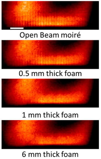 WOOFF images showing the open beam moirė pattern, the reduction in fringe visibility for three thicknesses of insulation, 0.5 mm, 1 mm and 6 mm. The white scale bar in the open beam image is 7 mm.