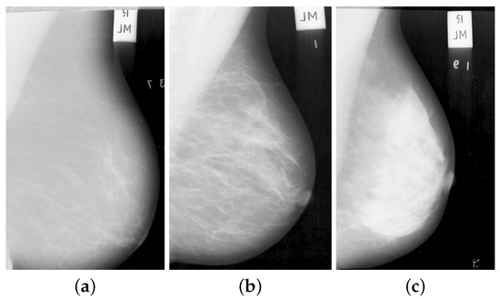 Example mammographic tissue types: (a) fatty, (b) glandular, and (c) dense tissue.