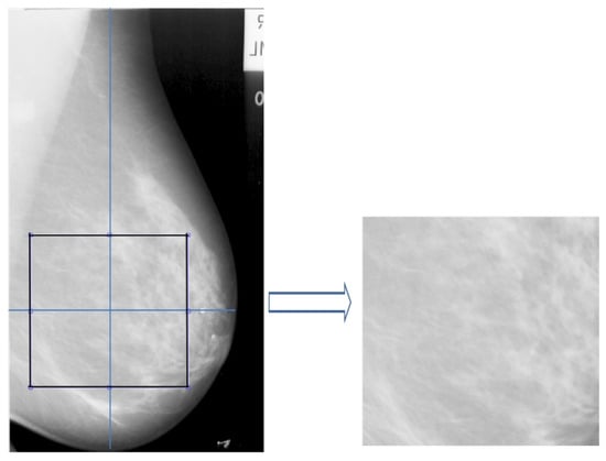 The mammographic images are pre-processed to remove the pectoral muscle and other artifacts (e.g., labels; see Figure 1) to extract the main breast region for processing [60]. The method, developed by the Chen and Zwiggelaar [60] separated the background region containing the annotations, labels and frames from the whole breast as the initial step. Subsequently, the method used histogram thresholding, contour growing and polynomial fitting method to remove the pectoral muscle from the breast tissue region. As most of the dense tissue and parenchymal patterns are situated within the breast fibroglandular disk area (the central region behind the nipple), we extracted ROIs from that region. The ROI was extracted ([51] for details) from each image in the MIAS database [61] with size equal to pixels as shown in Figure 2. The longest vertical and horizontal distance within the breast was estimated and the intersection point of the both lines was considered as the central point of the fibroglandular region for extracting the ROIs (see Figure 2). With this intersection point as the center, the ROIs of size were extracted. Noise reduction was performed on the extracted ROI using a median filter of size.