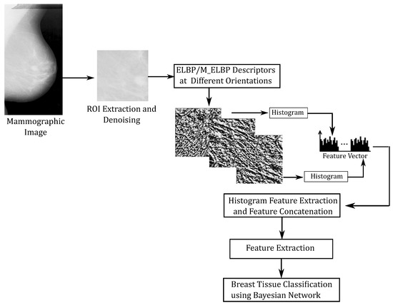 We have used Elliptical Local Binary Pattern (ELBP) [53], Uniform ELBP, Mean-Elliptical Local Binary Patterns (M-ELBP) [51], Local Binary Pattern (LBP) and LDP (Local Directional Patterns) [54] to capture intrinsic and detailed micro-pattern features from the mammographic images for breast tissue classification into fatty, glandular and dense breast tissue.