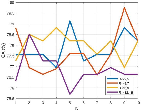 Similarly, to study the effect of the descriptor size on tissue classification, we performed the experiment as described in Figure 5 with varying size of and ( and ). For each elliptical size (varying sizes of ) with a neighborhood of eight, the feature extraction is done for eight different orientations. The extracted features at different orientations are concatenated and feature selection (extracting the most prominent features) is done as in Figure 5. Tahmassebi et al. [67] showed the importance of ranking and selecting the best extracted parameters while considering medical image data.