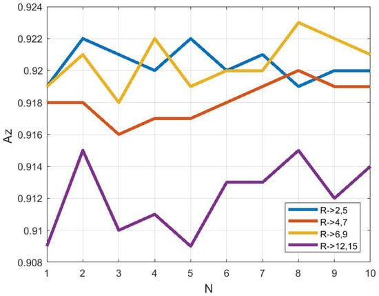 To compare the effect of descriptor size on classification, the M-ELBP operator with varying size of and were applied for the ROI size equal to pixels. In order to compute the stability of the approach we used a 10 run 10 fold cross validation scheme using a Bayesian network. The results showed that the descriptor classification remained stable with the change in size. Figure 7 shows the classification accuracy () to be , , and . The figure represents the classification accuracy obtained by the Bayesian Network classifier for each run (N = number of runs) for a 10-fold cross validation scheme. Similarly, from Figure 8, the area under the ROC curve() shows similar results as , , and for the M-ELBP descriptor of size , with a neighbourhood of eight pixels, respectively.
