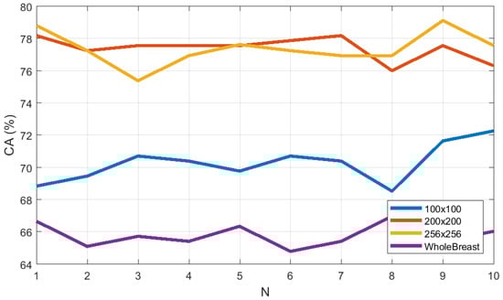Further experiments were done to estimate the effect of the ROI size and location in determining the classification accuracy. We estimate the classification accuracy while using the whole breast, or ROI sizes varying from , to pixels were selected from the fibroglandular disk region. The classification results for the M-ELBP descriptor with size and using the Bayesian Network classifier for 10 run 10- fold cross validation. Figure 9 and Figure 10 shows the variation in classification accuracy (N indicate a distinct run) while the whole breast region (, ) or an ROI of size pixels (, ) are selected. The most appropriate ROI size for this study was found to be between pixels (, ) to pixels (, ) from the fibroglandular region due to the presence of the appropriate parenchymal patterns. This showed that if the ROI size is small, classification can be affected due to minimum dominant features. Similarly, if the ROI size is too large or include irrelevant regions like tissue near the pectoral muscle or the breast boundary regions can result in extracting less discriminant features. In case of choosing the whole breast, the classification can be affected by irrelevant data resulting in a poor classification accuracy as it extracted multi-class texture information making it difficult for discriminating the prominent features for each density class. So the study showed that choosing the correct ROI size and location can lead to improved density classification inline with similar studies in the field [58,59].