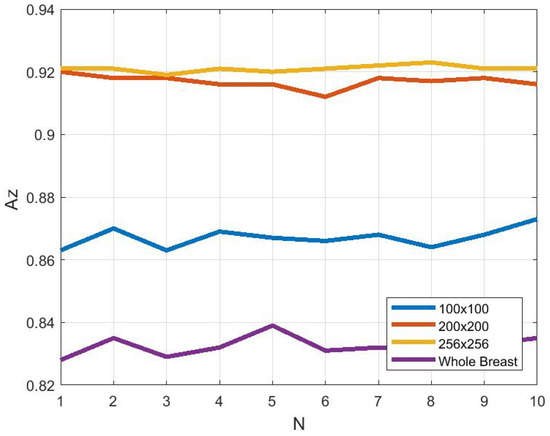 Breast ROIs have been used for texture analysis in detecting and classifying different breast abnormalities [56,57]. The analysis and classification of breast density depends upon the breast size and location of the ROI [58,59]. To analyse the effect of ROI location, Li et al. [58] performed a risk estimation on breast parenchymal patterns on breast ROIs at different locations behind the central nipple area using texture features. The study showed a significant decrease in performance when the ROI location moved backwards from the central region. Similarly, Sharma et al. [59] completed a study to analyze the effect of the size of the ROIs for classification and concluded that larger ROIs (above pixels) did decrease the classification accuracy due to inclusion of more tissue and smaller ROIs were affected by lose of important tissue pattern features.
