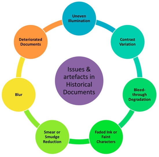 There are several methods to transform the handwritten documents to digitally compatible text. For example, optical character recognition (OCR) can be used to read text from these documents and store the information in digital text []. However, most of the OCR tools are limited by the quality of the document available. Handwritten prehistoric documents, in general, suffer from various degradations. Some of the major factors destroying the legibility of such documents include seepage of ink, uneven illumination, image contrast variation, background “noise”, and other factors. In addition, handwritten text shows different changes in stroke width, stoke connection, and pressure on the surface. Historical documents are also affected by bleed-through, an artefact like water blobs that occurs due to one side of ink on the paper passing through to other side. Moreover, some old content in documents may degrade due to fungus, as these documents have been kept in the same environment for long periods of time. The above issues or artefacts existing in the original documents make it difficult for an OCR system to recognize the text accurately and store them in digital form. In order to deal with these challenges, researchers have widely utilized image processing-based methods to overcome different degradations in documents. The method is referred to as image binarization. Under these conditions, necessary filtering techniques must be introduced to get rid of noise from historical documents entirely and enhance their quality before libraries unveil them for the public to see. The role of binarization is to make a separation between the text that appears on the foreground of the page and the degraded background in document images. In the past, several efforts have been made by scientists to improve binarization schemes and provide a better method for the enhancement of quality of degraded documents in order for an OCR to read and store the correct information in digitized forms. Although several attempts have been made in the past in this domain, degraded document binarization is still an unsolved problem for better accuracy, efficiency, and effectiveness. With the open area of research in this domain, this paper aims to review different issues and challenges in terms of degradation of documents associated with historical documents and the methods that have been implemented to deal with such issues, followed by the future directions towards implementing improved techniques for degraded document binarization.