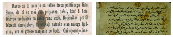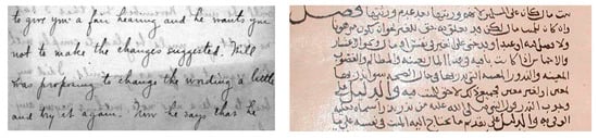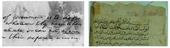 Many times, documents written in the past consist of very thin or weak text. In general, these documents were written with the help of ink or sometimes drawn with paint. Due to the quality of ink or paint used in historic documents, they start to degrade as their ink start to shrink. In other cases, the use of low-quality ink and the nature of paper used also resulted in thin or weak text that makes it difficult to apply binarization methods and extract the text accurately. Researchers, as of late, have been showing more interest in prehistoric document image analysis, which has brought forward various new challenges. Degradation in historical documents such as weak or thin texts have encouraged researchers to come up with enhancement and binarization algorithms good enough to fix these issues []. Successive phases in terms of algorithms such as skew detection, recognition, and page or line segmentation were then created for binarized data. An example of thin or weak text is shown in Figure 9.