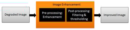 Ancient and historical documents, either handwritten or printed, generally suffer from various degradations. Some of the major factors destroying the legibility of such documents include seepage of ink, uneven illumination, image contrast variation, background noise, stroke width, stroke connection, bleed-through and water blobs. There have been several efforts to handle such degradations in historic documents. Contrasts can be defined as a variation in brightness. Most of the time, it acts as the difference between certain objects or features within the image, or among objects and the background []. Factors such as noisy environment, sunlight, illumination, and occlusion often cause contrast variation, which is extremely non-linear and expressive [], in particular, to historical and ancient document contrast and may vary within a scanned image due to uneven illumination. A physics-based method was described in Reference [] and References [,] to recover degraded outdoor scene contrast. Schechner and Karpel [] introduced a physical model that can handle image degradation. The concept of this approach includes finding scene depth with the help of a polarizer where a number of images are taken with varying orientations. One can deal with image contrast issues by applying contrast enhancement techniques. Lately, a number of researchers came up with new image enhancement models of their own to fix the contrast variation and luminosity issue. An extremely common image enhancement technique is histogram equalization (HE) []. This method is usually considered for image enhancement due to the better performance and simplicity it comes with, regardless of image type. Many researchers have also stressed the need for improving histogram equalization-based contrast enhancement such as adaptive histogram equalization that allows one to locally enhance contrast []. The fact that this technique treats the image globally makes it quite special []. The method also helps in the case of images with foregrounds and backgrounds which may be either dark or bright in degraded documents.