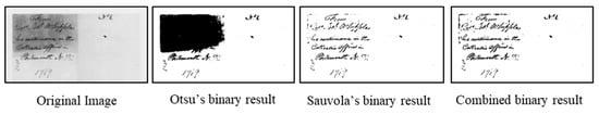- Su, B.; Lu, S.; Tan, C.L. Combination of document image binarization techniques. In Proceedings of the 11th International Conference on Document Analysis and Recognition (ICDAR), Beijing, China, 18–21 September 2011; pp. 22–26. [Google Scholar]