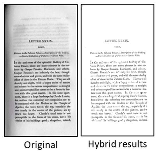 In the previous sections of this article, degraded document issues were discussed, followed by the global and adaptive thresholding approaches used during the binarization process. The process of local or global thresholding have their own advantages and disadvantages, and one can use the strength of both local and global thresholding methods in order to provide a better mechanism. This concept has been seen as an efficient solution, and researchers have come up with methods combining both the approaches and named the new approach hybrid binarization methods. There are several benefits of hybrid binarization methods, and one can take into consideration the computation time, flexibility and efficiency of methods, robustness, and accuracies in terms of background and foreground region extractions. This approach has been considered by Su et al. [], where different thresholding methods were combined to provide significantly better outcomes. In this approach, an improvement was carried out by combining global (Otsu’s) and adaptive (Sauvola’s methods) for better image binarization. In the same study, algorithms developed by Gatos’s and Su’s methods were combined along with combining Lu’s and Su’s methods, which resulted in the best approach. Figure 14 shows an example of combining binary methods as proposed by Su et al. [].