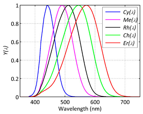The present study has been made for the alfa-opic spectral sensitivity functions defined in [16,17]. CIE has recently issued a new standard (S 026/E:2018) for the metrology of optical radiation for ipRGC-influenced responses to light [54], where slightly different cone and rod sensitivity functions are proposed (their alfa-opic curves are replaced by the very similar S-, L-, and M- cone fundamentals, and the scotopic sensitivity curve), whereas the ipRGC (melanopic) function remains unchanged. The method described here can be adapted with no difficulty to this similar set of spectral curves.