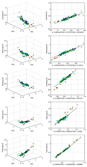 The synthetic photometry calculations described by Equations (1) and (2) were performed for all the lamps contained in the sample used in this study. The results, displayed as point clouds in the G-normalized 3D space () are shown in the left-hand column of Figure 3 for the cyanopic, melanopic, rhodopic, chloropic, and erythropic band-weighted radiances. These clouds of points can be fitted with reasonable efficacy by planes of the type described by Equation (8), determining the fit coefficients by the procedures above described. The results are displayed in the right-hand column of Figure 1, where the values of are plotted against the independent variable defined by optimum linear combination . Table 1 summarizes the coefficient values and the standard deviation of the residuals of the fits.