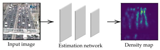 In the multi-scale network, several crowd images are fed into an estimation network to learn the characteristic of a crowd image in different conditions as shown in Figure 2c. A deep, single-column, and fully connected network was utilized to predict crowd density maps. This method addresses the issues of scale and perspective changes by feeding multiple scales of testing images into the estimation network during the prediction phase []. On the other hand, the dataset was categorized by the camera viewpoint. The input image in the different categories was trained to optimize an estimation network []. Similar to a multi-column network, their performance is limited to a variation of an input image in a different dataset.