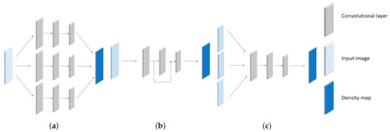 Over the past decade, CNN has been utilized for designing estimation networks in crowd counting. Their networks are categorized into 3 types, which are multi-column network, skip-network, and multi-scale network as shown in Figure 2a–c, respectively. Their features are described as follows: