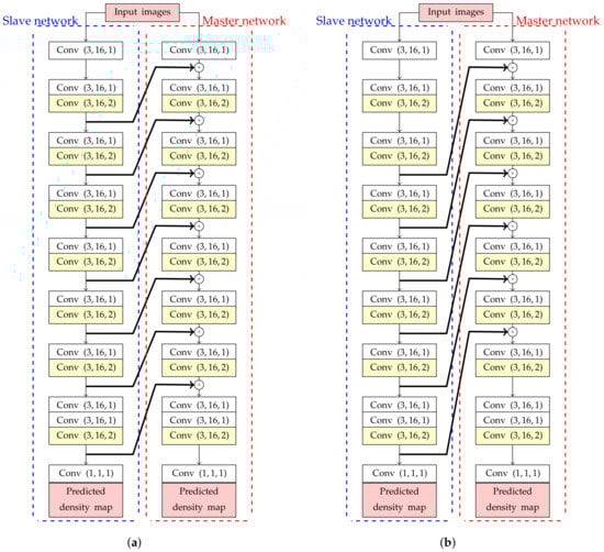 To design an estimation network with backward connections, high-level features need to be extracted before passing information into shallow layers. However, if these high-level features are simply added into shallow layers, it will create a cyclic loop in an estimation network. To solve this problem, the master and slave networks were designed in this study as shown in Figure 4. These two networks have the same sequence of Conv layers, but their weights are optimized independently. Even though both master and slave networks are optimized by the same loss function, predicted density from a master network is only extracted for calculating the number of object.