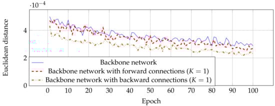 Even though estimation networks with forward and backward connections have similar performance as shown in Table 1, the backward was designed for improving the estimation performance in an earlier stage. This means that this technique reaches the most optimal parameters faster than estimation networks without skip connections. Figure 6 shows the MSE from validated images in each epoch, where networks with backward connections have a low error at the beginning of training compared with the other two networks. This result indicates that estimation networks with backward connections can be trained faster by optimizing the feature map in shallow layers.