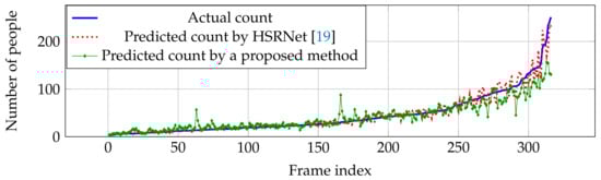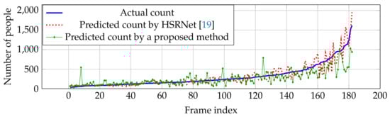 Compared with other estimation networks, our performance cannot overcome other estimation networks, especially CP-CNN [] and HSRNet []. Even though our result is not the best in the overall performance, our estimation network is more effective in high crowd density (>500 people), where HSRNet trends to have over-counting error shown in Figure 7. Similar with Part A, counting performance from Part B is effective in high crowd density, but obtain over-counting error from frame index 50 to 200 in Figure 8.
