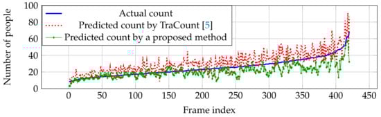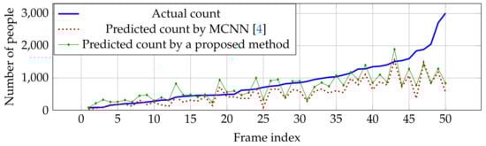 where N is the number of testing images. and are predicted and actual density maps from a master (’m’) network at a frame with index ’t’, respectively. MAE is more significant than RMSE for counting performance because RMSE is relative as the variance associated with the frequency distribution of error magnitudes also increases while MAE describes average error alone. RMSE is more difficult to tease out and understand. However, RMSE is utilized for evaluating the robustness of an estimation network []. Even though the predicted density was utilized for optimization, predicted count () calculated by Equation (12) was analyzed.