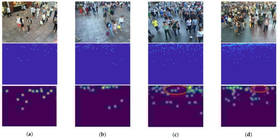 As described in Section 1, we expected that the object size is proportional to the level of feature. Low and high-level features are considered as features of objects with small and large scales that are located in high and low crowd density, respectively. By improving low-level features with backward connections, a high-level feature can also be enriched because of a sequential structure of CNNs. Figure 11 shows examples of crowd images with their actual and predicted density map. The result shows that predicted density maps have a similar pattern with an actual density map in various crowd density, especially in low density (Figure 11a,b). However, our network is ineffective to objects with small scales causing the under-counting error as shown in Figure 11c,d within the red circles, because their resolutions might be too small for extracting their features or the number of their images are insufficient.