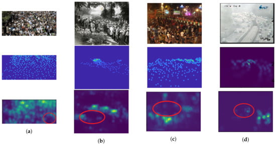 The examples of crowd images with different crowd density consisting of (a) 23, (b) 45, (c) 131, and (d) 297 people, where their input images, actual density maps, and predicted density maps by a proposed method are located in the 1st, 2nd, and 3rd rows, respectively.